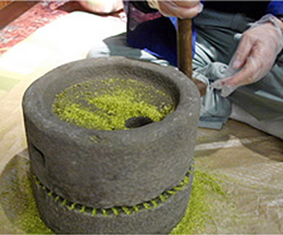 機械で挽くと熱が発生してしまうため、熱が発生しにくい【石臼】でゆっくり丁寧に粉にします。